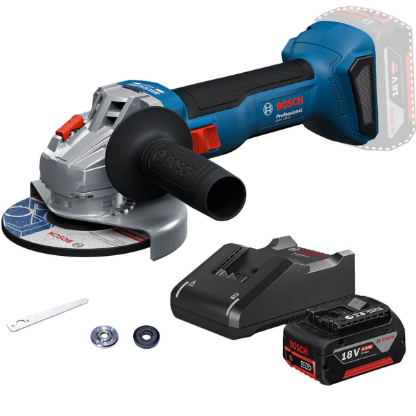 - У комплекті цього артикулу, крім шліфувальної машини, ви знайдете: захисний кожух, ключ під два отвори, затискну гайку, додаткове руків'я та кріпильний фланець. Також поставляється акумуляторна батарея GBA 18V 4 Ah і зарядний пристрій GAL 18V-40.