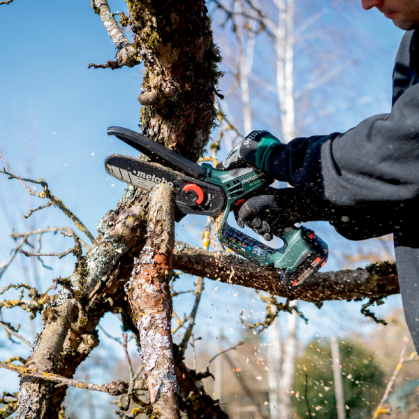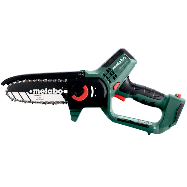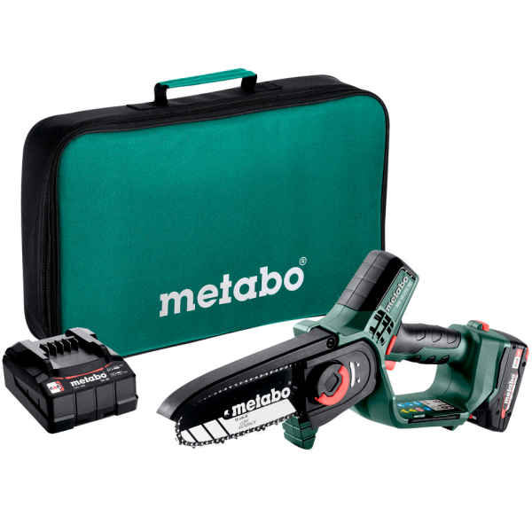Акумуляторна пила Metabo MS 18 LTX 15 з 15-сантиметровою шиною, у якій ланцюг має 39 ланок товщиною по 1,1 мм з кроком 1/4», призначена для обрізки кущів, дерев. Використовуючи телескопічну ручку MS (немає в комплекті), може служити висоторізом. Поставляється в сумці з блоком живлення LiPOWER 18 V 2 Ah, зарядним пристроєм SC 36.