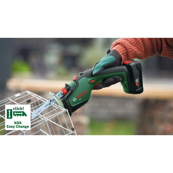 Bosch KEO 18 Li – побутова шабельна пила для використання в саду і домашньому господарстві. Живиться від літій-іонної акумуляторної батареї 18 В (в комплект не входить), розвиває швидкість до 2300 ход/хв. В моделі використовується полотно довжиною 150 мм, яке дає змогу пиляти деревину завтовшки до 80 мм.
