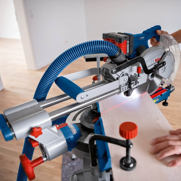 - Додатковою перевагою є сумісність із пилососами Bosch, що дає змогу ефективно видаляти тирсу та підтримувати чистоту робочої зони. Також пила підходить для використання з робочими столами серії GTA і пильними дисками, призначеними для акумуляторних торцювальних пил.