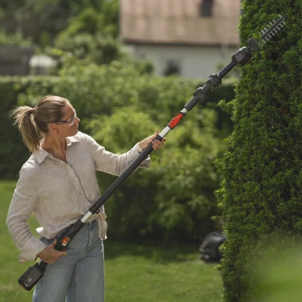 - Додаткова телескопічна штанга дає змогу збільшити робочу висоту дії кущоріза до 3 метрів і забезпечити ергономічне робоче положення садівника.