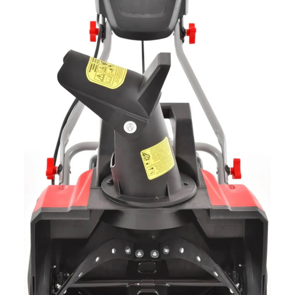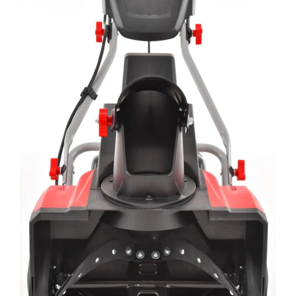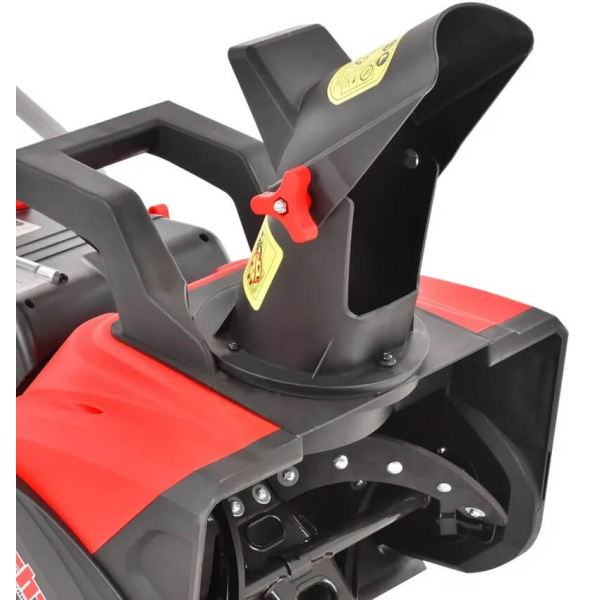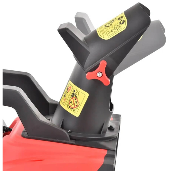 - Робоча ширина пристрою становить 46 см, а максимальна глибина прибирання — 27 см. Гумові планки на шнеку надійно збирають сніг, викидаючи його на висоту до 6 метрів. Напрямок викиду снігу можна регулювати прямо під час роботи, повертаючи жолоб на 190 градусів за допомогою спеціальної рукоятки. Для зручності переміщення і зберігання пристрій оснащено пластиковими колесами і складаною рукояткою, яка фіксується гвинтами-зірочками. На корпусі також є ручка для перенесення.