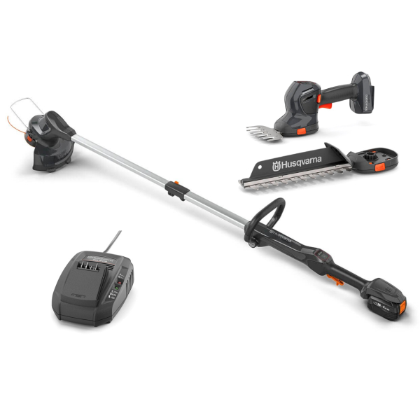 Акумуляторний тример Husqvarna Aspire T28-P4AKIT l Акумулятор 4.0 Ah, P4A 18-B72 l Зарядний пристрій П4А 18-С70 l Тримерна головка А15Б l Акумуляторні ножиці для кущів Aspire S20-P4A