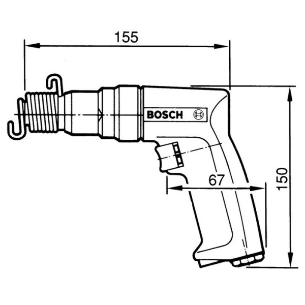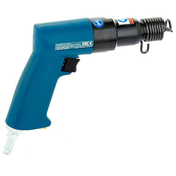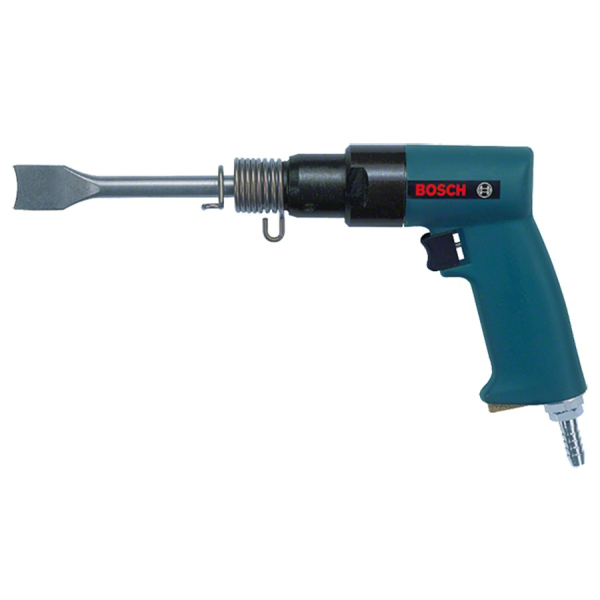 Пневматичний відбійник Bosch з частотою удару 3600 уд/хв з силою 0,002 кДж ефективно видаляє плитку, штукатурку, демонтує труби, пробиває стіни. Патрон SW 10 мм до округлих хвостовиків 10,2 мм. Робочий тиск 6,3 бар. Витрата стисненого повітря 8,5 л/с. Поставляється з долотом для різання труб, плоским долотом, зубилом, пружинною засувкою для фіксації зубила, з ніпелем для приєднання шланга та з чохлом.