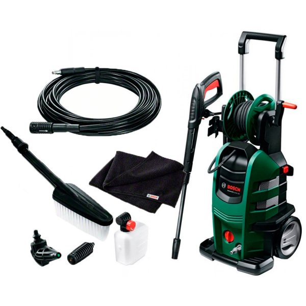 Мийка високого тиску Bosch AdvancedAquatak 160 потужністю 2600 Вт, з 4-циліндровим самовсмоктувальним насосом. Допустима температура води +40 градусів. Витрата води 570 л/год. Тиск 160 бар. Autostop. Фільтр для очистки води на вході. Телескопічна ручка, барабан для намотування шланга, місця на корпусі для зберігання приладдя. Набір для мийки авто.