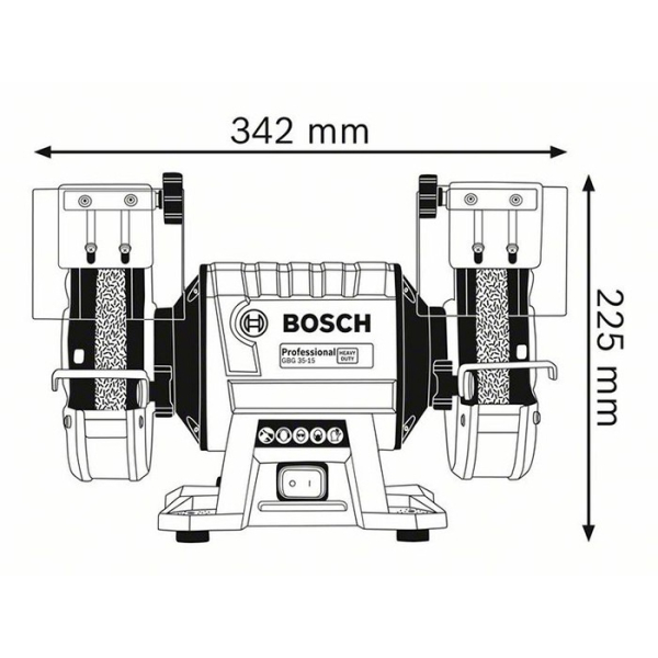 Двошпиндельне точило Bosch GBG 35-15 — потужний (350 Вт) з асинхронним двигуном, міцною основою, надійний профінструмент, що працює з двома шліфувальними дисками. Для роботи підходять шліфдиски діаметром 150 мм, шириною 20 мм, зернистістю 24, 60.