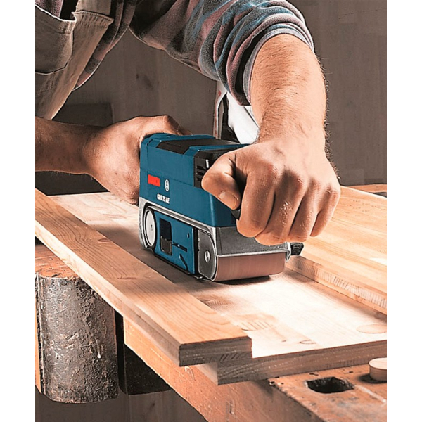 750-ватна шліфмашина Bosch GBS 75 AE з шліфстрічкою довжиною 533 мм та шириною 75 мм, з регульованою швидкістю руху стрічки від 200 до 330 м/хв. Пиловивідна система. Виконує сухе шліфування з великим зніманням поверхонь з деревини, пластмаси, шпаклівки. Поставляється з графітової плитою, шліфувальною стрічкою на тканинній основі та з мішком для збору пилу.