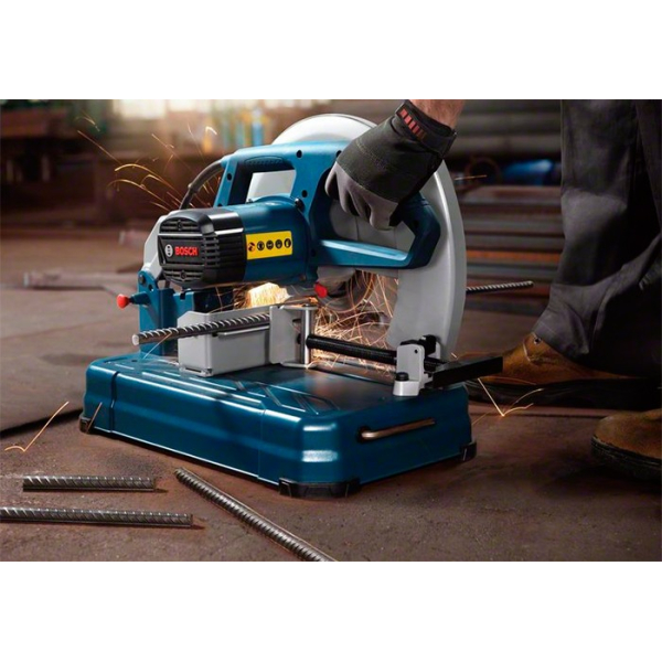 Настільна пила Bosch GCO 14-24 J потужністю 2400 Вт із швидкістю 3800 об/хв розрізає металеві вироби відрізними кругами 355 мм з отвором під посадку 25,4 мм. Продуктивність різання прямокутної заготовки під кутом 0 градусів 100x196 мм, квадратної — 119x119 мм, l-образного профілю — 130x130 мм.
