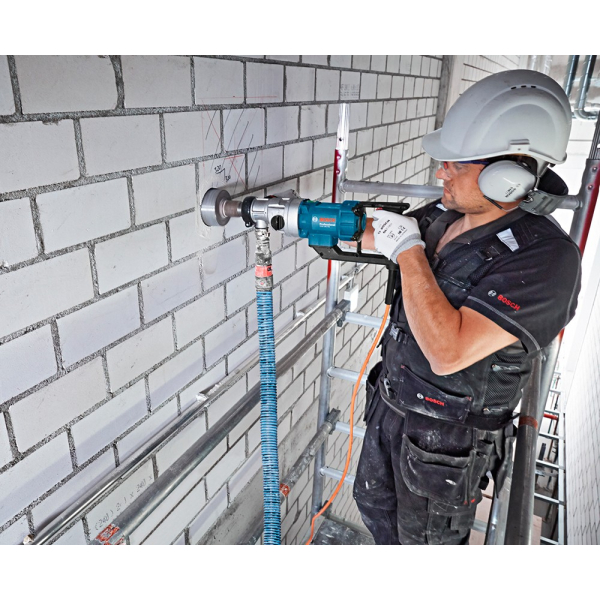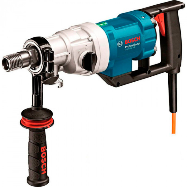 Bosch GDB 180 WE Professional призначена для свердління алмазними коронками. Підходить для сухого і мокрого свердління. Свердлить бетон і залізобетон. Встановлено мотор потужністю 2000 Вт. Дві швидкості: 1 швидкість - 900 об / хв, 2-а - 2,8 тис об / хв. Може використовуватися з свердлувальною стійкою з системою подачі води. Просвердлює отвори в цеглі і в бетоні від 0 до 18 см. Встановлено патрон 1 1/4 "UNC. Подача води з максимальним тиском 3 бар. У комплектацію входить кейс для зберігання, свердлильна стійка GCR 180, перехідник для пиловідведення і кульовий кран.