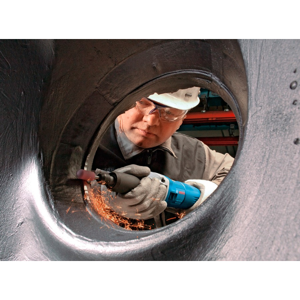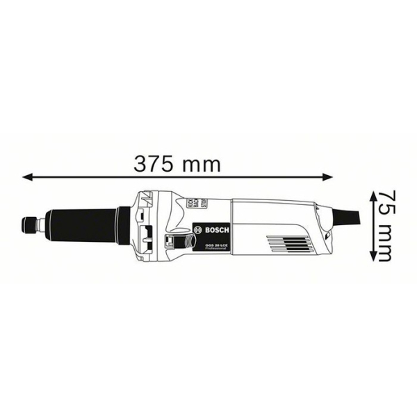 Шліфувальна машина Bosch GGS 28 LCE прямого типу потужністю 650 Вт. Регульована частота обертання насадки 10000-28000 об/хв. Довга шийка шпинделя діаметром 43 мм. Затискні цанги підходять діаметром до 8 мм. Працює з абразивним інструментом діаметром до 50 мм. Обмеження пускового струму. Електронний стабілізатор. Поставляється з двома гайковими ключами 13 і 19 мм, і затискним блоком, в який входять затискна гайка і цанговий затиск 6 мм.