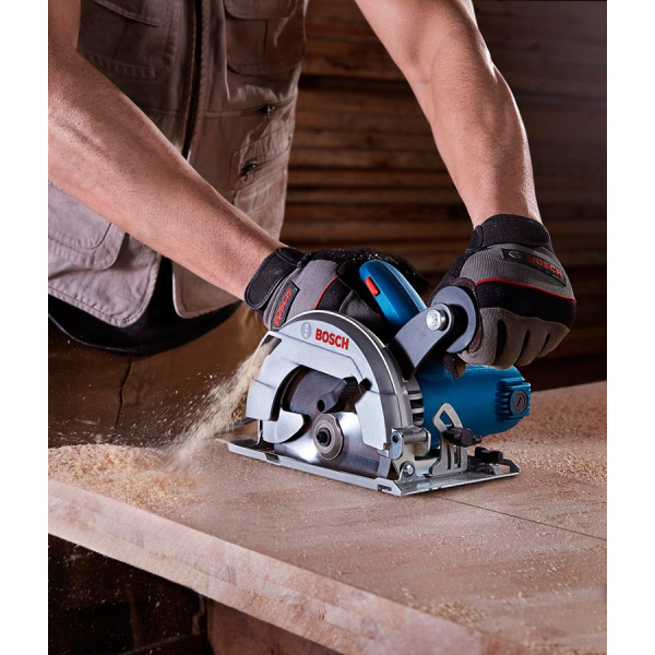 1200 Вт професійна ручна дискова пила Бош GKS 600 працює з дисками 160-165 мм, які здійснюють до 5200 об/хв, швидко та чисто розпилює дерев'яні заготовки товщиною до 55 мм. Пиляє під нахилом 45 градусів деревину до 37 мм. Шкала регулювання кута розпилювання. Блокування шпинделя. Опорна плита 235×138 мм. Знімна додаткова рукоятка. Поставляється у картонній упаковці.