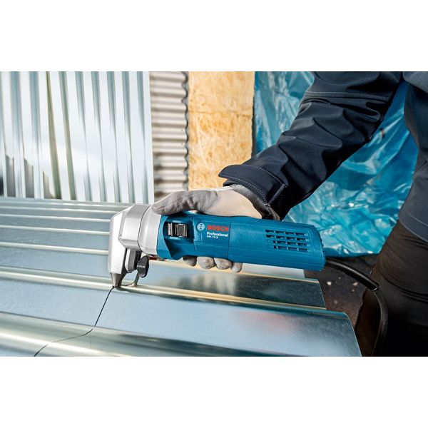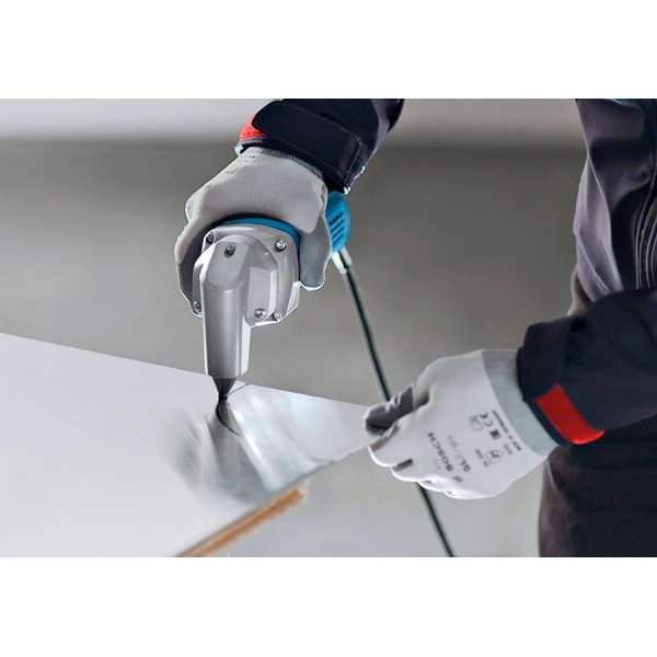 Розрізати прямо-, криволінійно листи металу 1,6 мм по товщині, не деформуючи їх краї, допоможуть ножиці Bosch GNA 75-16. Потужність 750 Вт. 2600 ход/хв. Найменший радіус при криволінійному різанні 40 мм. Доріжка шириною 5 мм. Вимикач з фіксацією. Спрямованість різання встановлюється в трьох позиціях з кроком 90 градусів. Інструмент разом з матрицею та пуансоном доставляється в картонній коробці.