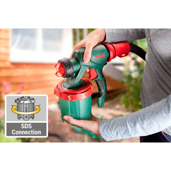 - Всі частини інструменту з'єднуються за допомогою системи SDS. Це дозволяє провести швидку заправку фарби під час роботи або провести очищення.