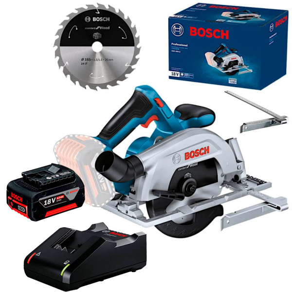Акумуляторна дискова пила | Акумулятор Bosch GBA 18V 4.0Ah + зарядний пристрій GAL 18V-40 (1600A01B9Y) | 1 диск для циркулярної пилки Standard for Wood 165x1.5/1.0x20 мм (24 2 608 842 540) | Паралельна напрямна (1 619 P16 999) | Документація | Картонна коробка