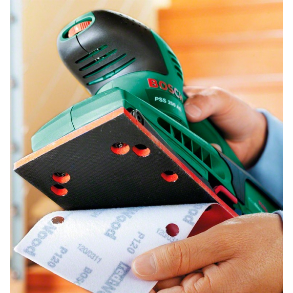 - Шліфмашина Bosch PSS 250 AE на основі вібруючої шліфпластини розміром 93x182 мм підходить для остаточного шліфування рівних поверхонь з різних матеріалів. Ідеально підходить для обробки деревини, пиломатеріалів, пофарбованих поверхонь.