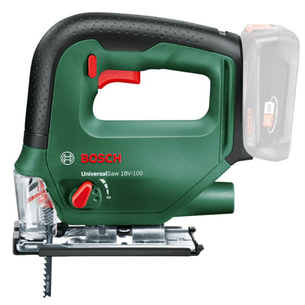 Лобзик акумуляторний Bosch Universal Saw 18V-100 ефективно ріже деревину (товщину 100 мм), алюміній (18 мм), сталь (8 мм), пластик, кераміку, гуму. Працює від літій-іонного акумулятора з напругою 18 В. Хід пили складає 20 мм, робоча швидкість 0-2600 хід/хв. Пиляльне полотно за необхідності замінюється безінструментально (SDS). Оснащений інструмент плавним пуском, системою якісного різу по лінії (CutControl), 4-ступінчастим маятником. Кут налаштовується у діапазоні 0-45° в обидві сторони. Комплектується 2 пиляльними полотнами по дереву, захистом від сколювання тощо. Важить лобзик без акумулятора 1.6 кг.