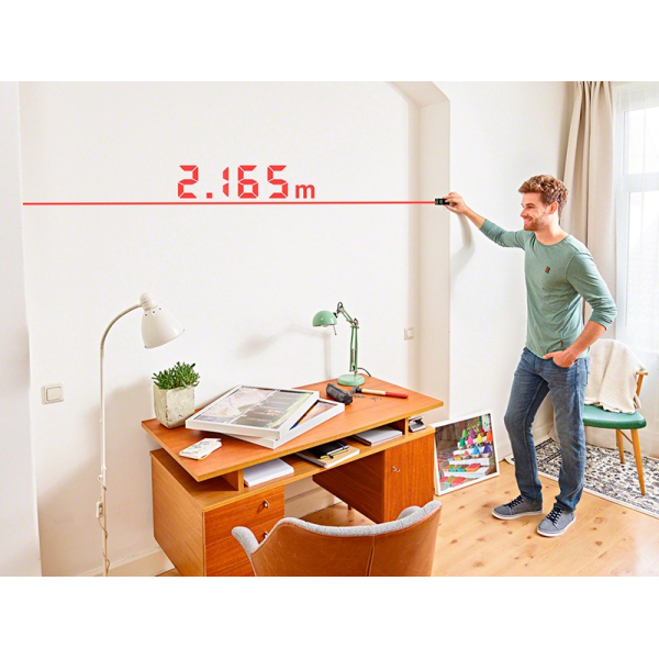 - Завдяки особливій лазерній технології швидко (0,5-4 сек) та точно (± 3 мм) виміряти відстані, довжини, висоти, віддалення (від 0,15 до 20 м) та розрахувати площу допоможе цифровий лазерний далекомір Bosch Zamo III.