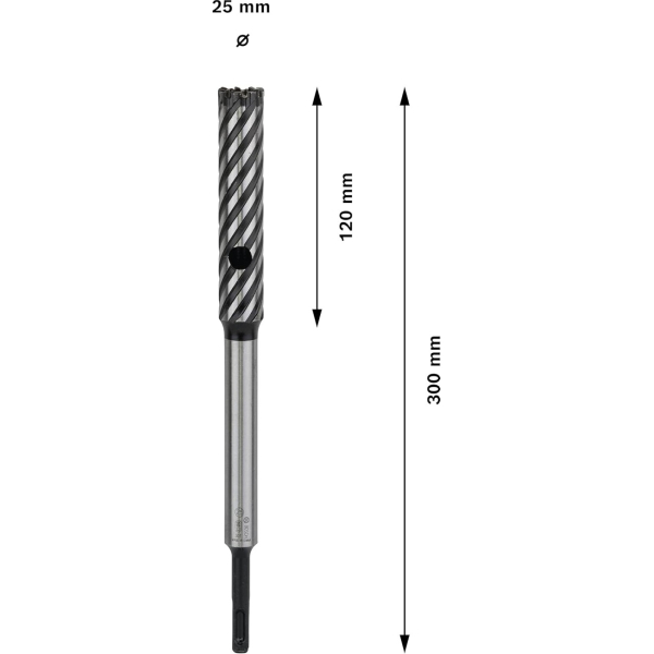 - Діаметр 25 мм, робоча довжина 120 мм і загальна довжина 300 мм дають змогу виконувати глибокі прорізи та забезпечують стабільність у процесі свердління.