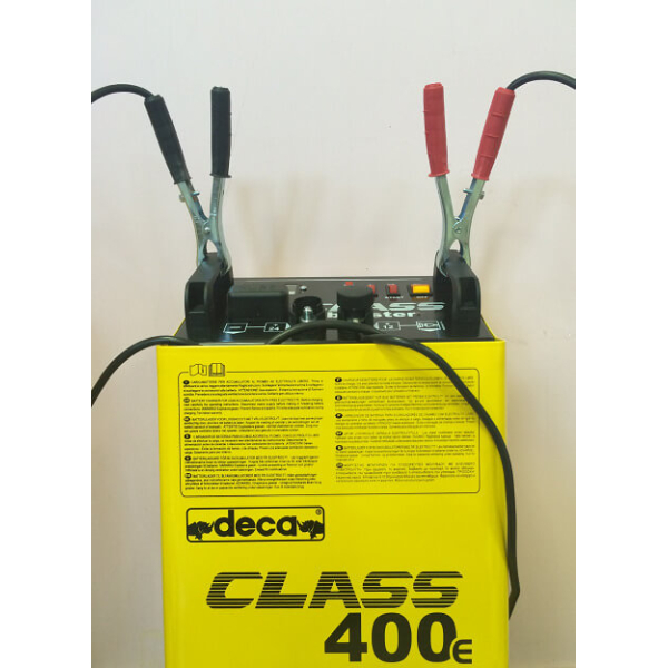 Deca Class Booster 400E — універсальний прилад 2 в 1, що поєднує в собі зарядний і пусковий пристрій для акумуляторів автомобільної та садової техніки. Живиться від однофазної мережі 230 В. Працює з АКБ напругою 12 та 24 В, запускає двигуни автомобільної, садової та аграрної техніки на бензині та дизелі. Має вбудований аналоговий амперметр, 4 позиції заряджання. Колеса та ручки для транспортування.