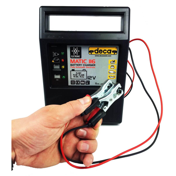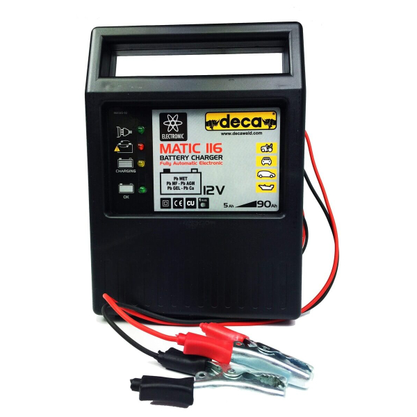 Автоматичний зарядний пристрій Deca Matic 116 для заряджання акумуляторів 12В. Працює від мережі 230В. Підтримує зарядку АКБ WET, GEL, AGM, AGM Power, MF, Ca/Ca, Start & Stop. Зарядний струм до 6А, світлодіодна індикація, є електричний захист.