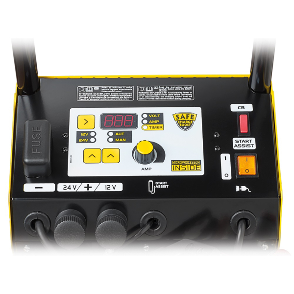 Потужний 230В пускозарядний пристрій для 12/24В АКБ ємністю до 1000 А/год. Зарядний струм 80А, пусковий — 500/900А