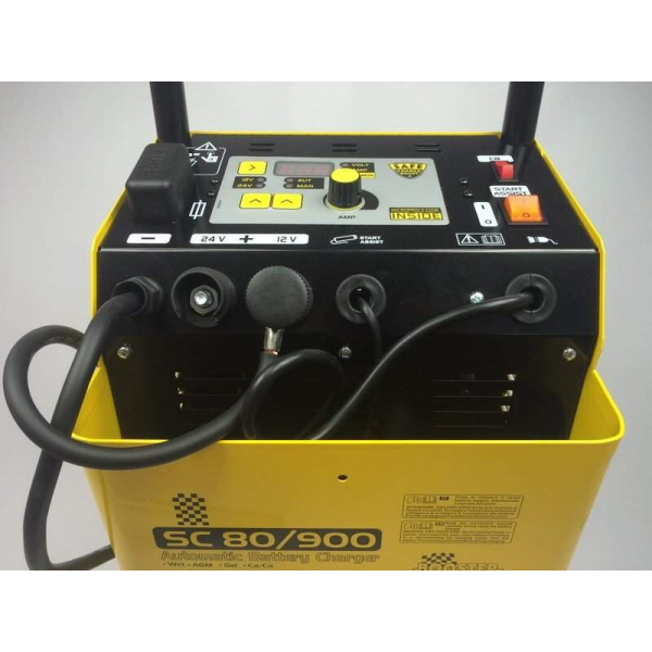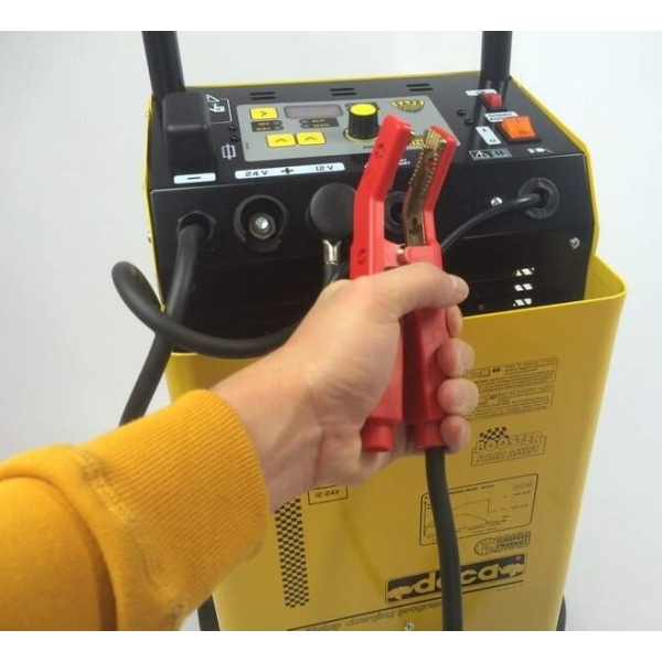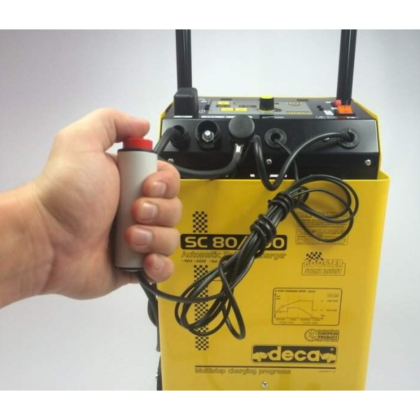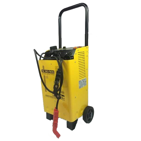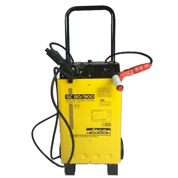 Deca SC 80/900 — універсальний прилад 2 в 1, який поєднує в собі зарядний та пусковий пристрій, що живиться від однофазної мережі 230В. Працює з АКБ напругою 12 і 24В, запускає двигуни авто техніки на бензині та дизелі. Має вбудований вольтметр і амперметр, є функція таймеру. Колеса та ручка для транспортування.