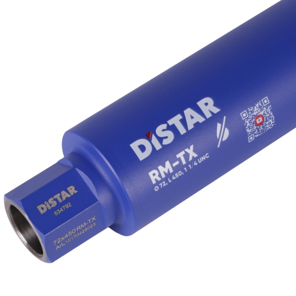 - Коронка Distar RM-TX — це професійне приладдя для сухого алмазного свердління з трубчастою конструкцією. Його застосовують у поєднанні з алмазними буровими установками, на ручних свердлильних машинах з мікроударом без необхідності використання охолодження для створення отворів у різних міцних матеріалах, включно з армованим і неармованим бетоном, каменем із важким армуванням, гідротехнічним бетоном і цеглою.