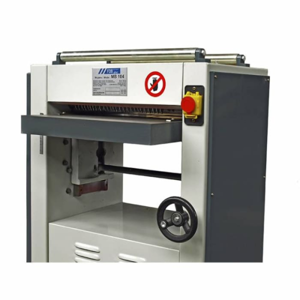 FDB Maschinen MB104 професійний апарат для стругання дерев'яного брусу і дощок до 400 мм завширшки, висота стругання досягає 120 мм. Асинхронний електромотор 2,2 кВт живиться від трифазної мережі 380 В. Ножовий вал розвиває швидкість до 4000 об/хв, подача матеріалу виконується зі швидкістю 12,5 м/хв. Вага моделі становить 160 кг, розмір – 700х650х800 мм.