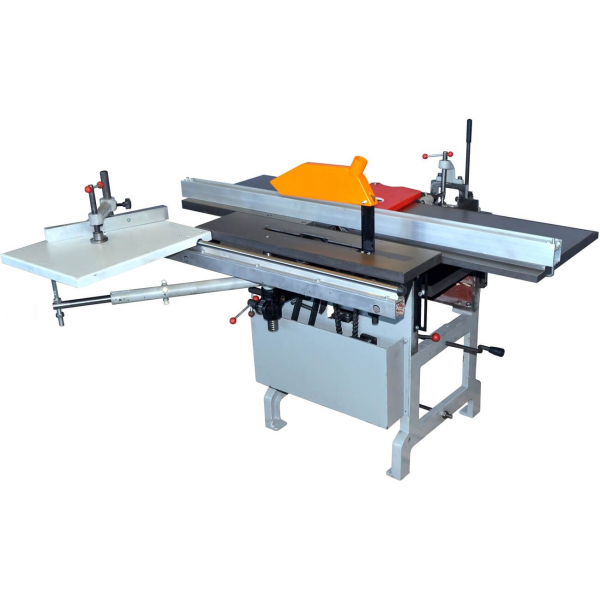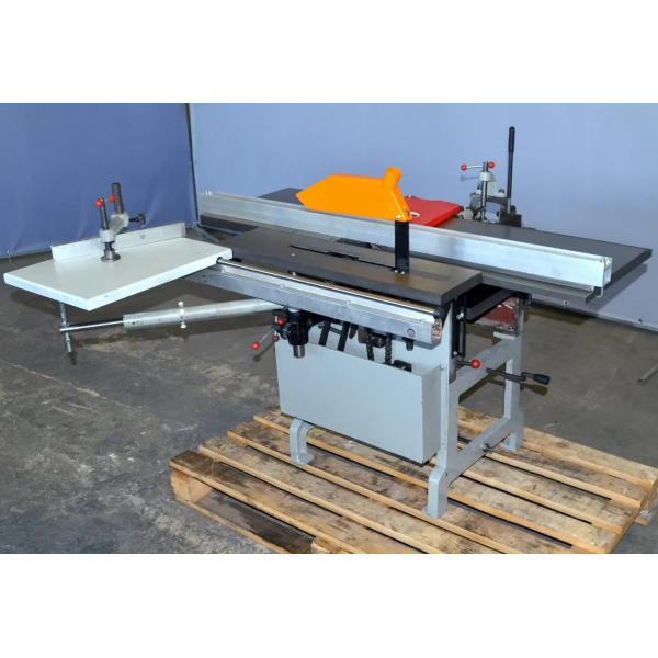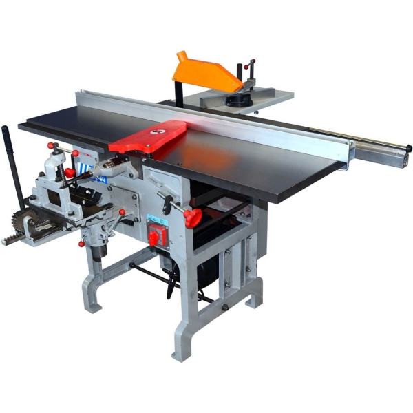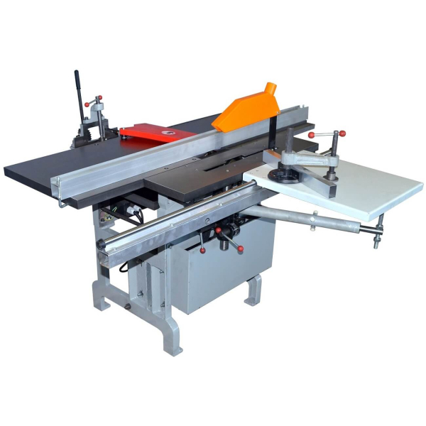Багатоопераційне обладнання | Асинхронний двигун | Жорстка чавунна рама посиленої конструкції | Передача на двох клинових ременях | Функція заточування ножів фуганка, дискових пилок та фрез | Конічний тип приводу регулювання глибини фрезерування | Захисний кожух з можливістю підключення до cистеми пиловидалення