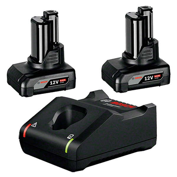 Зарядний пристрій Bosch GAL 12V-40 Professional із зарядним струмом 4 А швидко підживлює літій-іонні акумулятори 10,8-12 В ємністю від 2 Ah. Абсолютна сумісність з усіма акумуляторами Bosch Professional 12 B. Два акумулятора GBA 12V по 6 Ah.