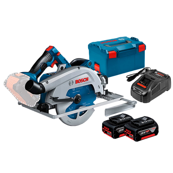 Акумуляторна циркулярна пила Bosch GKS 18V-68 GC Professional працює з дисками 190 мм з регульованою швидкістю (2500-5000 об/хв). Розпилює деревину товщиною до 68 мм під кутом 90°, до 50 мм під кутом 45°. Працює від акумулятора 18V. Сумісна з системою напрямних шин FSN. Фіксатор шпинделя. Можливість установки Bluetooth® модуля. Поставляється в L-Boxx 238 з 2 акумуляторами GBA 18V 5 Ah та зарядним пристроєм GAL 1880 CV, з пиляльним диском 190 мм і паралельним упором.