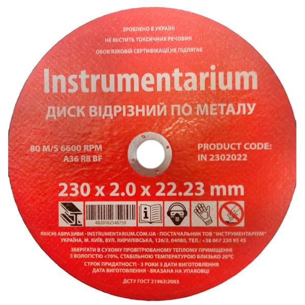 Високопродуктивний відрізний диск Instrumentarium A36 R8 BF діаметром 230 мм, товщиною 2 мм, з посадкою 22,23 мм для різання металів. Використовується на кутових шліфмашинах 230 мм. Не містить токсичних речовин.