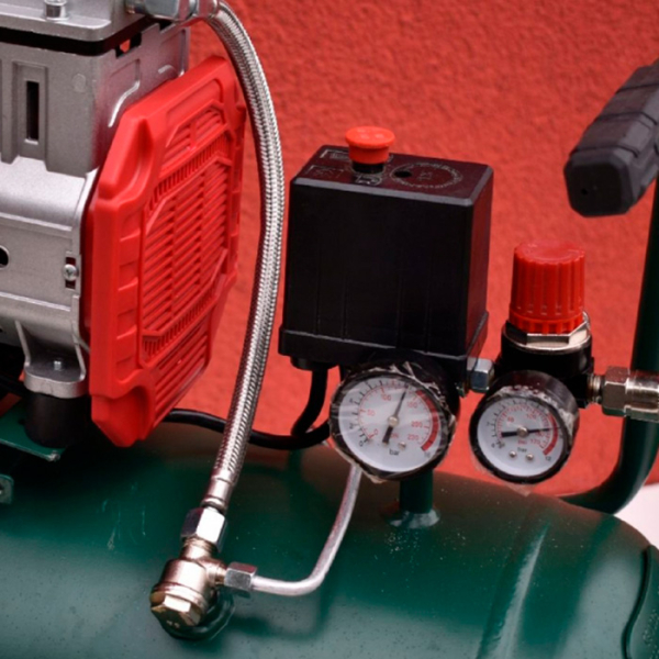 - Два манометри дають змогу одночасно контролювати тиск у ресивері та на виході.