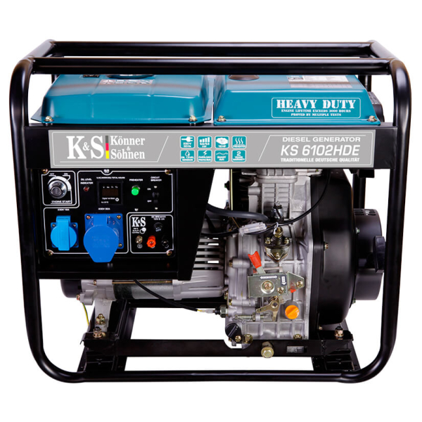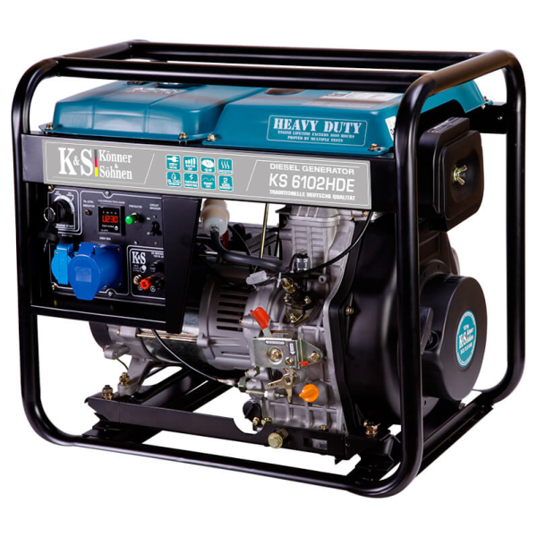 Дизельний електрогенератор Konner&Sohnen KS 6102HDE з серії Heavy Duty виробляє однофазну (230 В) напруга. Максимальна потужність 5,5 кВт, номінальна — 5 кВт. Двигун KS 440HD об'ємом 418 см3 потужністю 12 л.с. Два варіанти запуску в роботу: ручний та електростарт. Масляний бак 1,65 л. Акумулятор 30 Ah. Передстартовий підігрів. Автоматичне регулювання напруги (AVR). Посилена рама з гумовими опорами. Лічильник мотогодин.