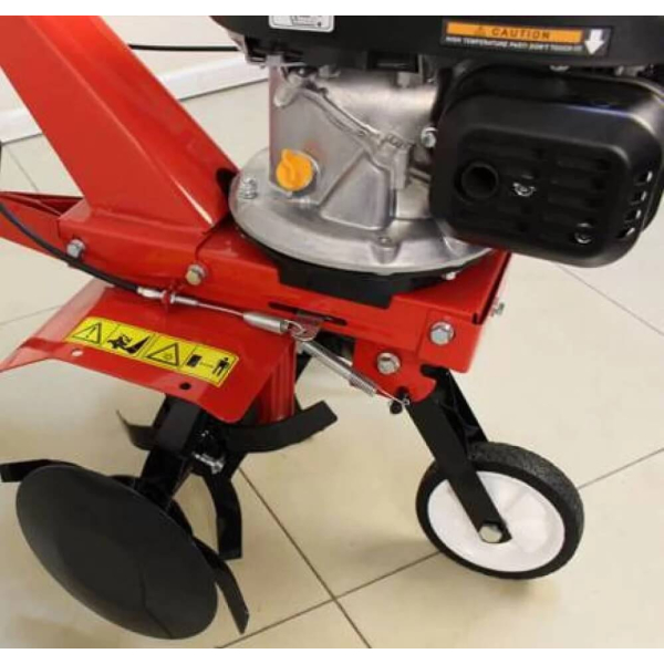 - Переднє колесо не тільки слугує для керування, а й забезпечує точніший контроль над глибиною обробки. Регульований задній зуб-шпора працює як гальмо, зменшуючи фізичне зусилля оператора та покращуючи якість ґрунту.