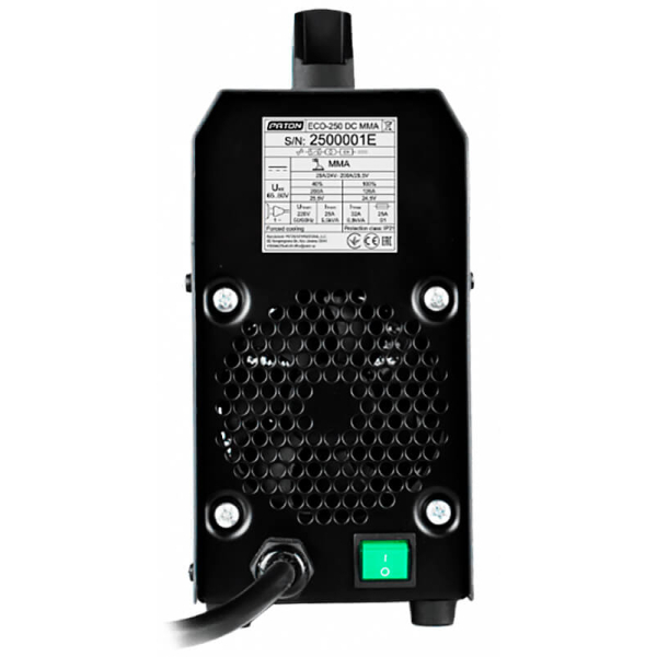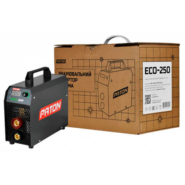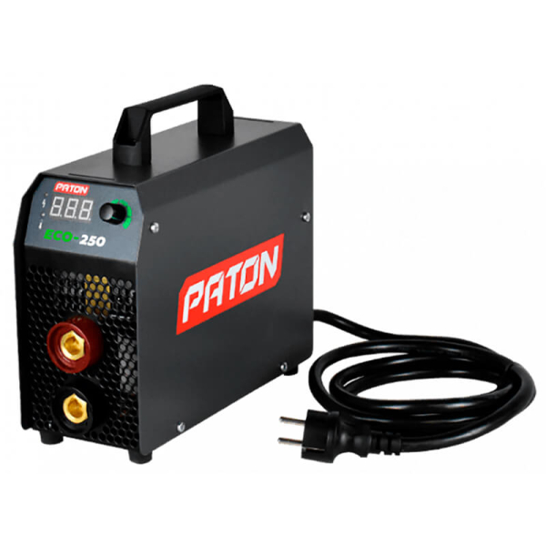 Випрямляч інверторний Патон ECO-250-C призначений для ручного дугового зварювання (РДС «ММА») на постійному струмі. Головні переваги апарату — екологічність, економічність, мала вага (4,3 кг), компактні розміри, доступна ціна. З номінальним зварювальним струмом 250 А випрямляч підходить для використання в домашніх майстернях, у приватному будівництві. Адаптований до побутової мережі. Функції «Гарячий старт», «Форсаж дуги», «Антиналипання». Напруга підпалу дуги 110 В. КПД 90%. Тривалість навантаження 40%. Напруга холостого ходу при РДС 80 В. Для роботи підходять штучні електроди 1,6-5 мм включно тугоплавкі. Поставляється апарат в кейсі з 3-метровим кабелем з електродотримачем, 3-метровим кабелем з клемою «маса», ременем для перенесення.