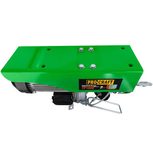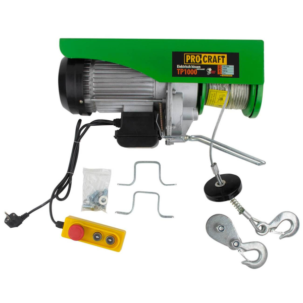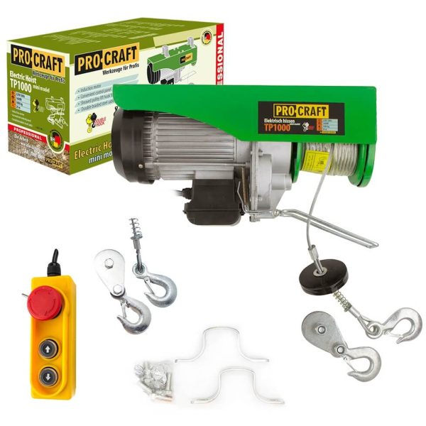 Тельфер або електричний підйомник Procraft TP1000 розроблений для підйому вантажів масою до 1000 кг на висоту до 20 м. Діаметр його троса становить 6 мм, а швидкість підйому варіюється до 8 м/хв. Електролебідка оснащена двигуном потужністю 1600 Вт, що працює від стандартної побутової електромережі з напругою 220В. Для зручності експлуатації пристрій обладнано пультом керування.