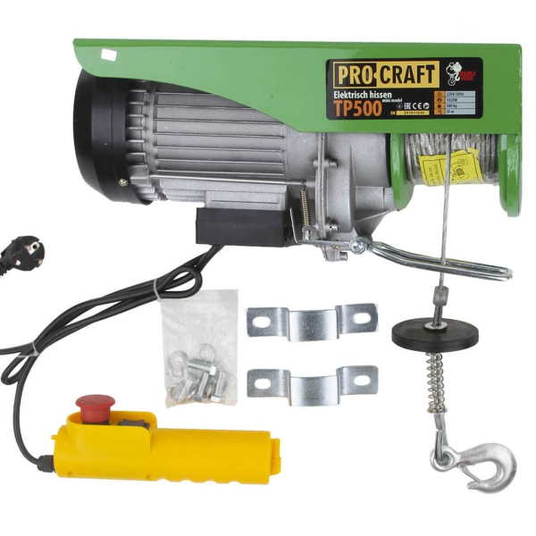 - Тельфер Procraft TP500 — це надійний і ефективний пристрій для підйому і переміщення вантажів масою до 500 кг в умовах обмеженого простору. Ідеально підходить для виконання різноманітних завдань у майстернях, гаражах, ремонтних боксах, автомайстернях та інших виробничих приміщеннях. Цей універсальний пристрій стане чудовим помічником під час демонтажу силових агрегатів, виробництва тротуарної плитки або транспортування готової продукції.