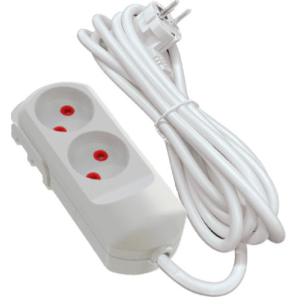 - Тип подовжувача: побутовий універсальний подовжувач у корпусі з 2 розетками, без контактів заземлення. Довжина кабелю — 2 м.
