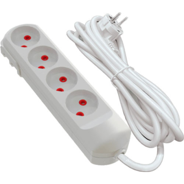 - Тип подовжувача: побутовий універсальний подовжувач у корпусі з 4 розетками, без контактів заземлення. Довжина кабелю — 2 м.