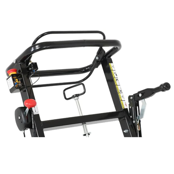 - Модель має міцну сталеву конструкцію, пристосовану до високих навантажень. Є зручне руків'я управління та два великі колеса для переміщення апарата.