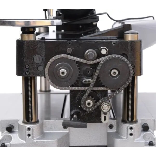 - Конструкція з верхнім розташуванням двигуна економить час, усуваючи потребу у виставленні висоти допоміжних роликових опор щоразу під час зміни висоти різу. Через редуктор з масляною ванною потужність на подавальні ролики відбирається безпосередньо з ріжучого вала. Посилена ланцюгова передача забезпечує жорстку подачу і тривалий термін служби.