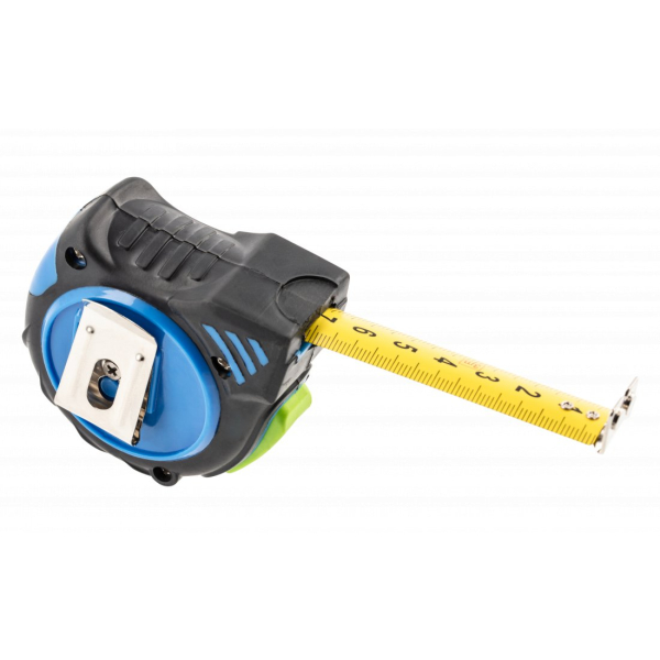 - Корпус рулетки виконаний з міцного ударостійкого пластику з елементами з нековзного матеріалу, завдяки чому інструмент зручно і безпечно тримати в руці. Для зручності носіння та швидкого доступу рулетка оснащена практичним металевим гачком, який можна закріпити на поясі або кишені.