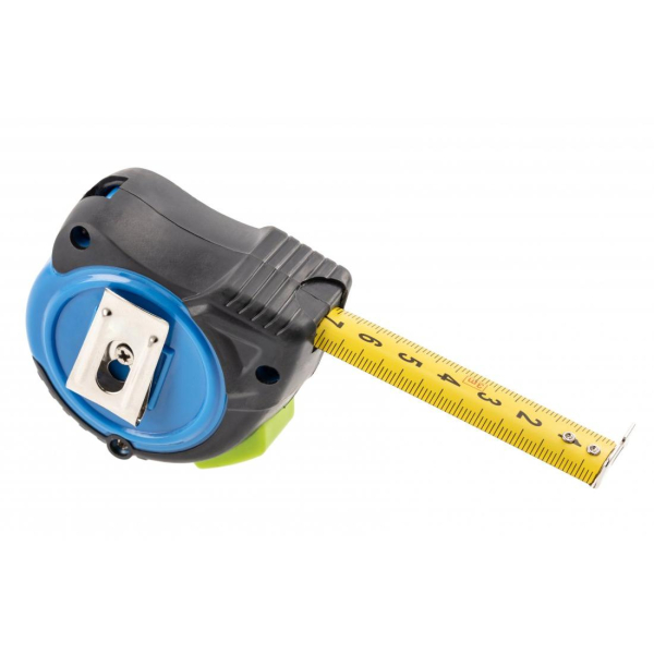 - Корпус рулетки виконаний з міцного ударостійкого пластику з елементами з нековзного матеріалу, завдяки чому інструмент зручно і безпечно тримати в руці. Для зручності носіння та швидкого доступу рулетка оснащена практичним металевим гачком, який можна закріпити на поясі або кишені.