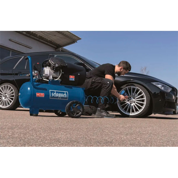 - Високоякісний двоциліндровий масляний компресор Scheppach HC55DC продуктивністю 322 л/хв з регулюванням тиску на виході практичний для застосування у більшості майстерень, гаражів, на СТО.