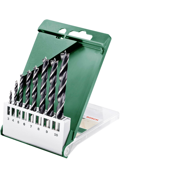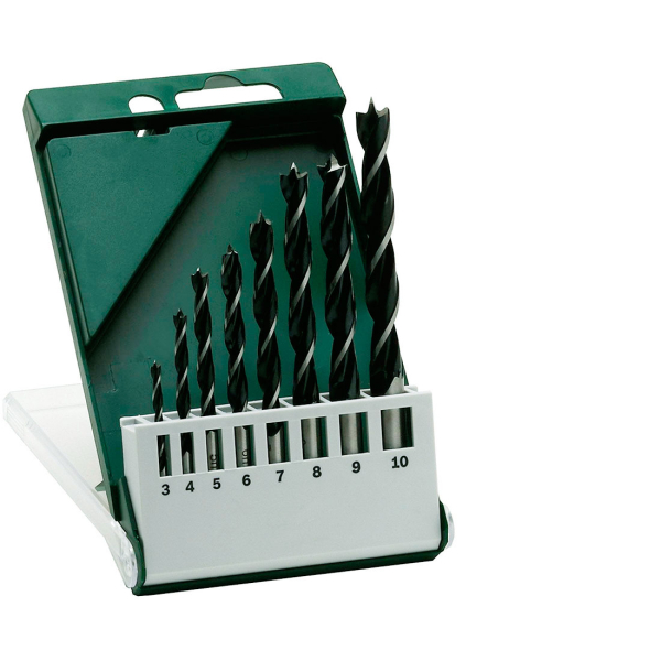 - 8 спіральних свердел діаметрами 3, 4, 5, 6, 7, 8, 9, 10 мм з центруючим вістрям і циліндричними хвостовиками для свердління деревини різної твердини.