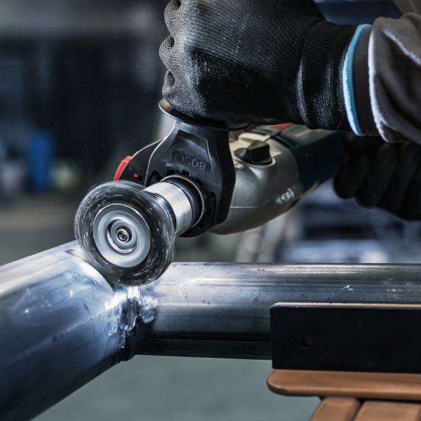 - Дискова щітка Bosch діаметром 100 мм, шириною 10 мм, з гофрованим сталевим дротом товщиною 0,30 мм.