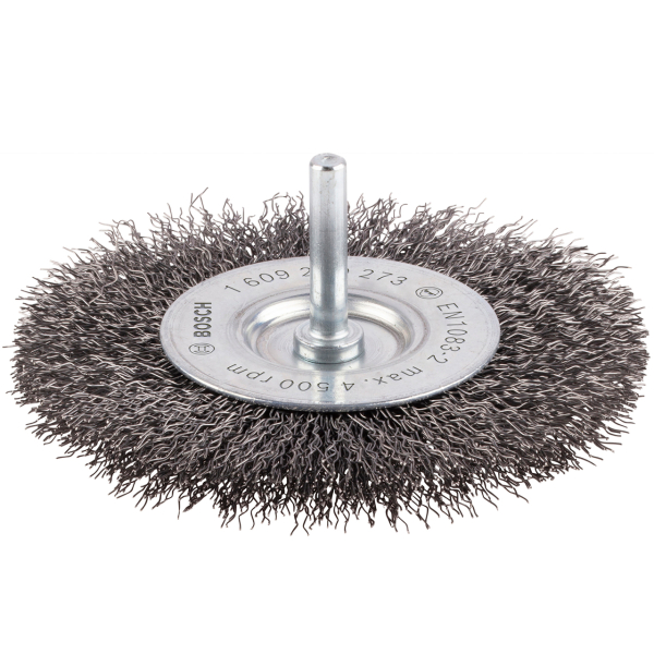 Дискова щітка Bosch діаметром 100 мм, шириною 10 мм, з гофрованим сталевим дротом товщиною 0,30 мм. Хвостовик 6 мм. Для обробки металів з вмістом заліза, кольорових металів. Розрахована на максимальну швидкість обертання 4500 об/хв.