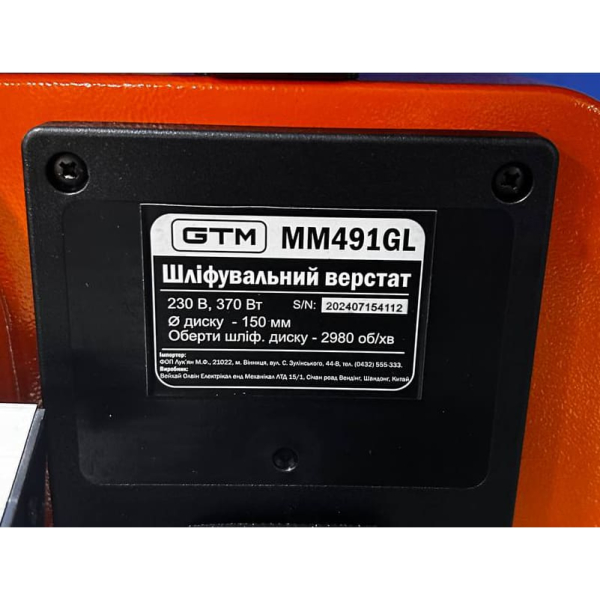 Шліфувальний верстат GTM MM491GL | Шліфувальний круг 150 мм | Робочий стіл | Мітчик калібру | Захисний кожух диска | Картонна упаковка