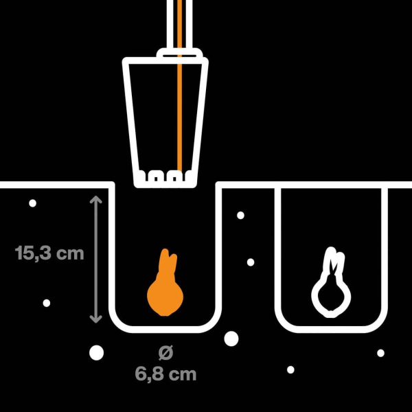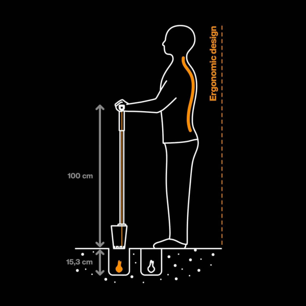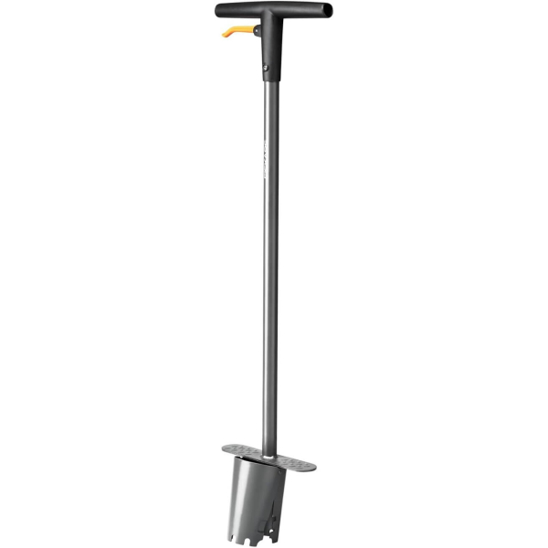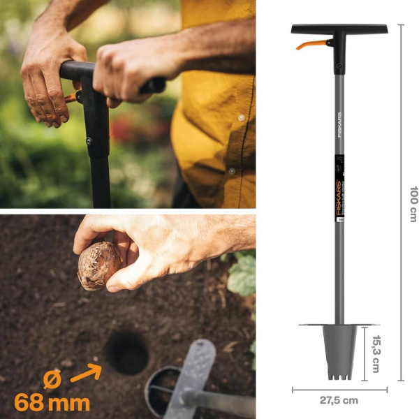 - Fiskars Ergo підходить для посадки цибулин і саджанців діаметром до 68 мм на глибину до 150 мм, даючи змогу точно й акуратно виконувати посадку навіть на щільних ділянках землі.